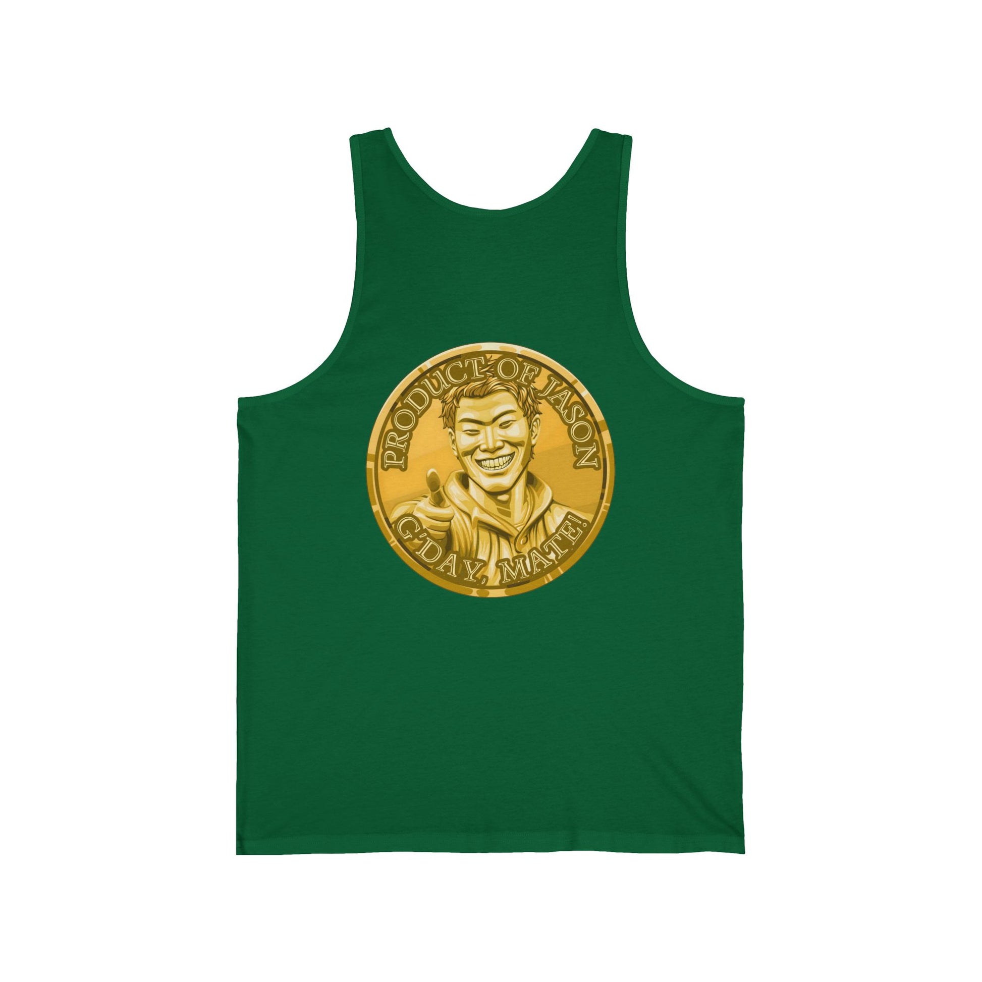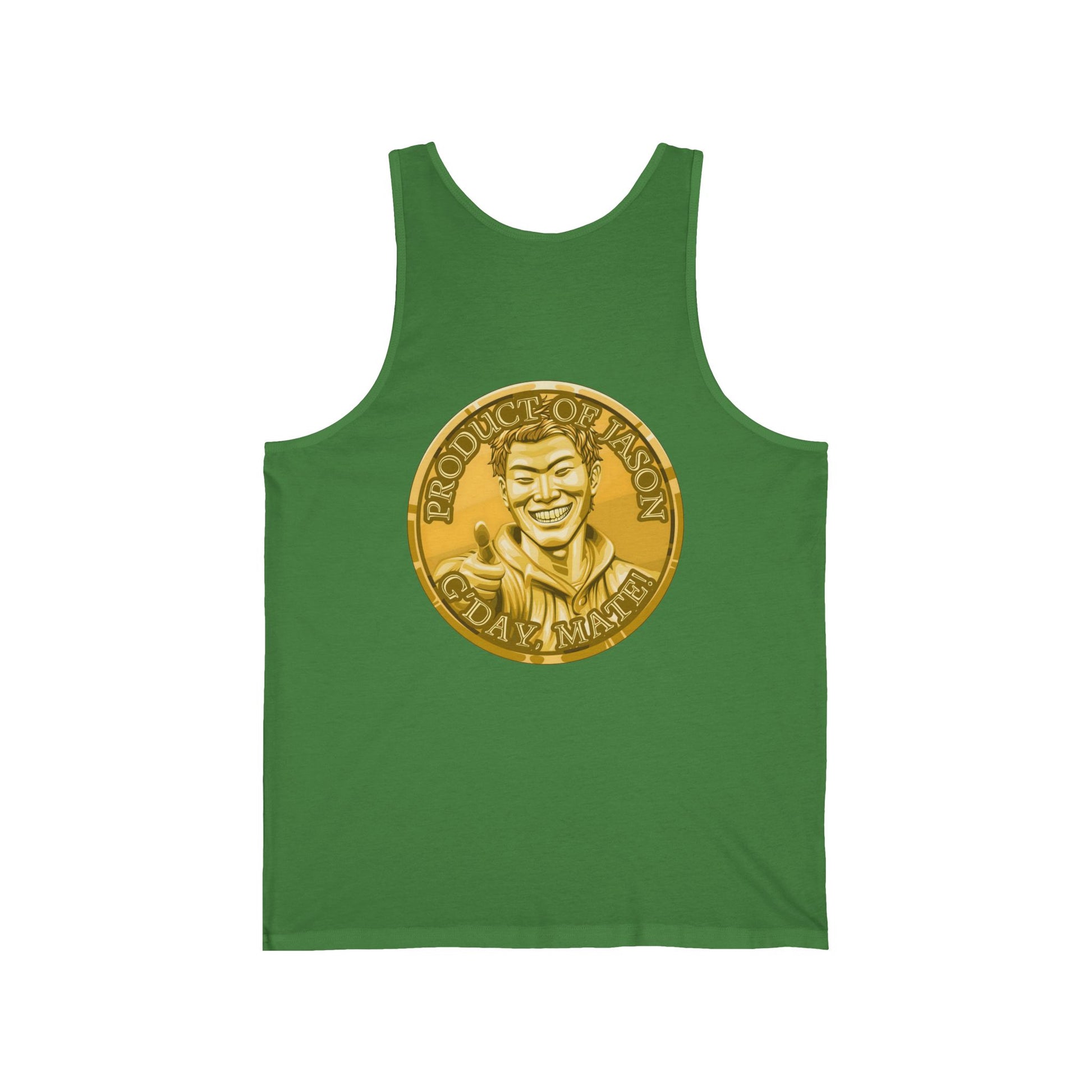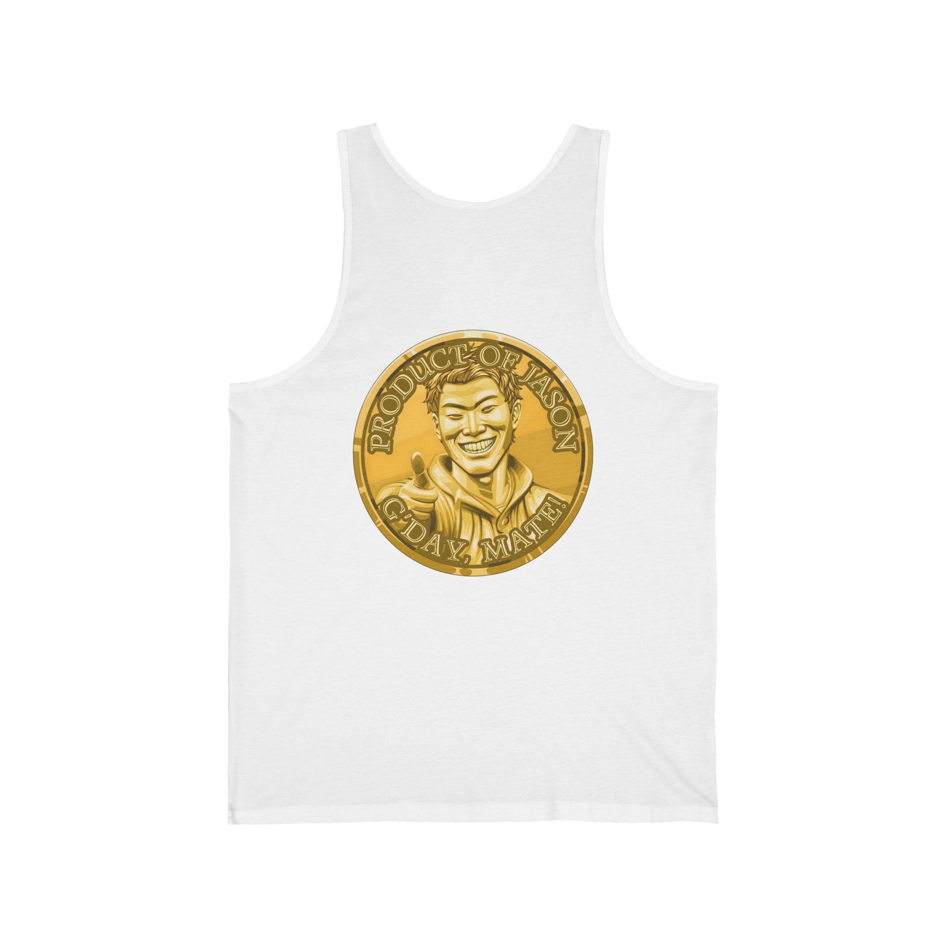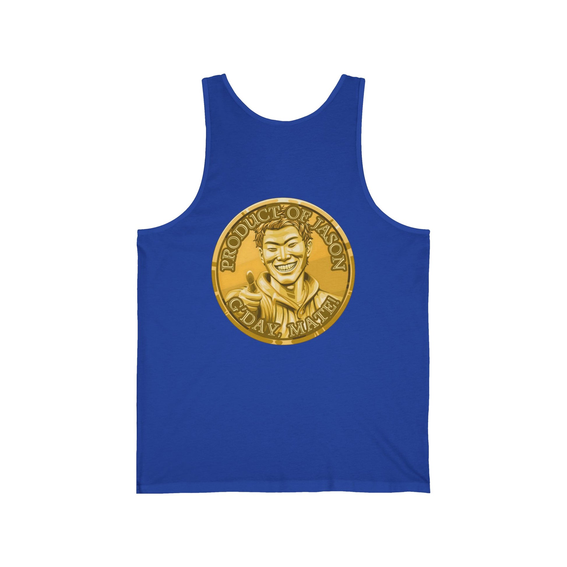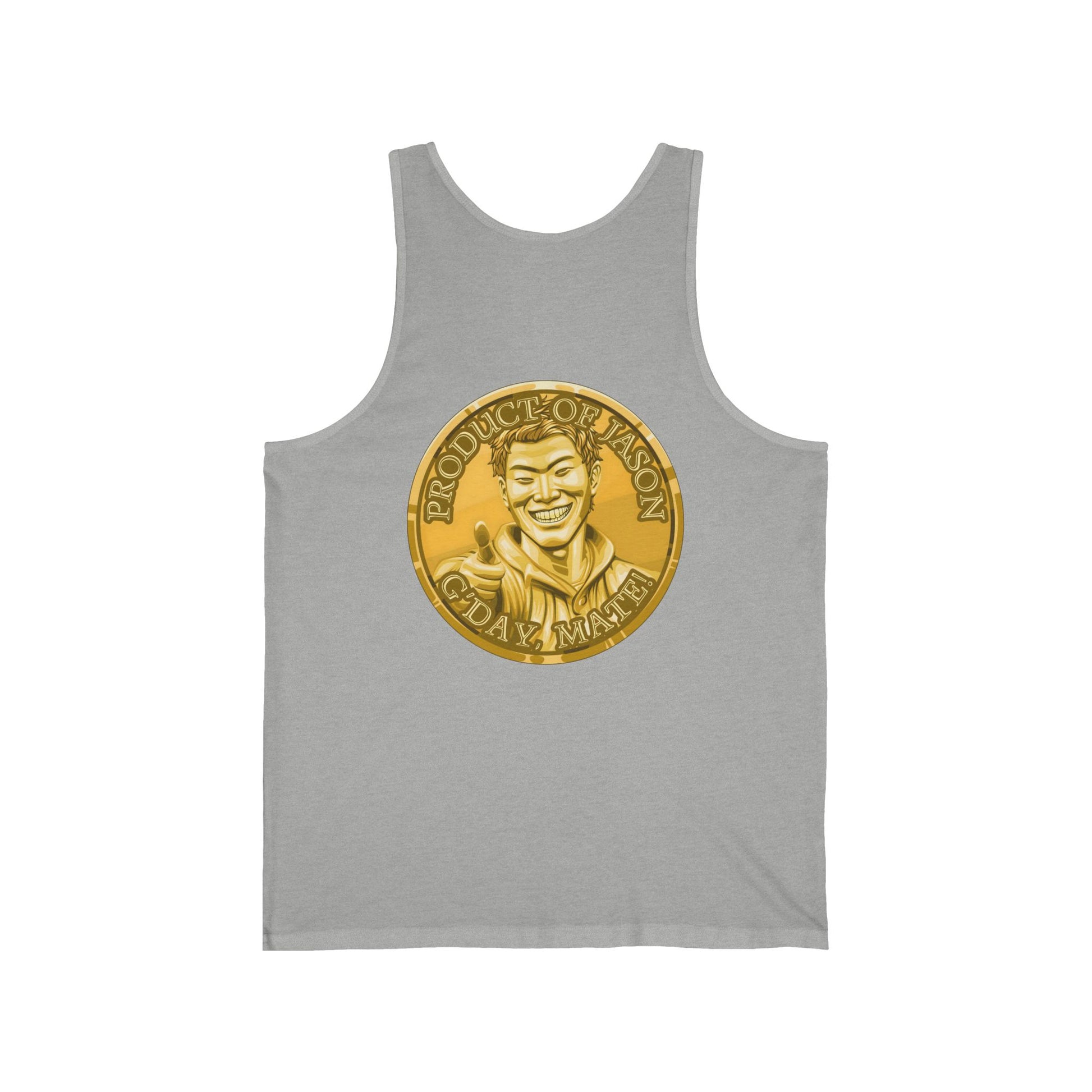 This unique tank top is a fanfiction depiction of the tank top that Jason Asano is awarded for completing the Sanguine Horror quest that says "I WENT TO A MAGICAL ALTERNATE UNIVERS AND ALL I GOT WAS VAST COSMIC POWER". On the back is a fan fiction representation of the GOLD SPIRIT COIN that Jason Asano's looting ability creates. This must-have unisex jersey tank top fits like a well-loved favorite. High quality print makes it an ultimate statement shirt for years to come. This item has side seams to provide structural support. All bindings are the same fabric as the rest of the tank. Depending on the color, cotton, polyester, or rayon can appear.