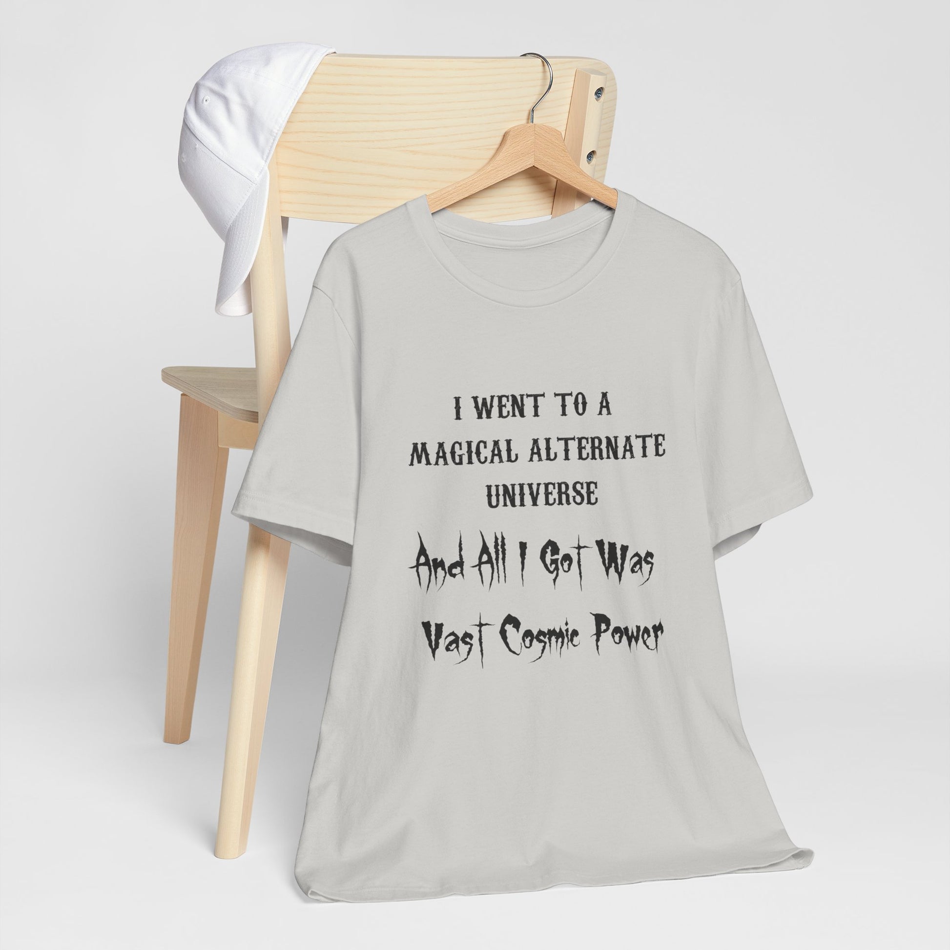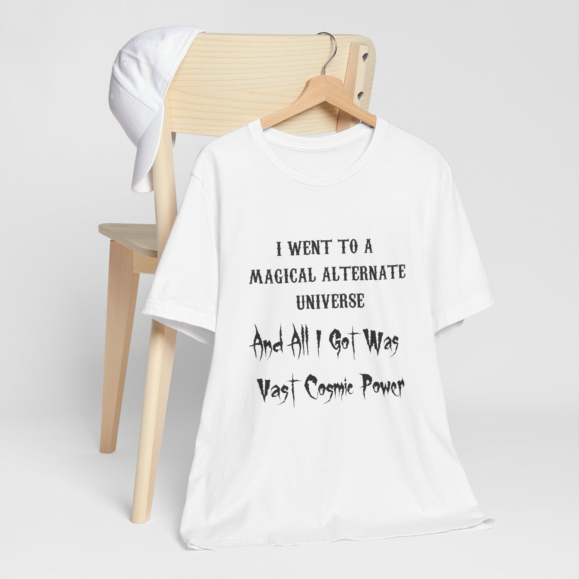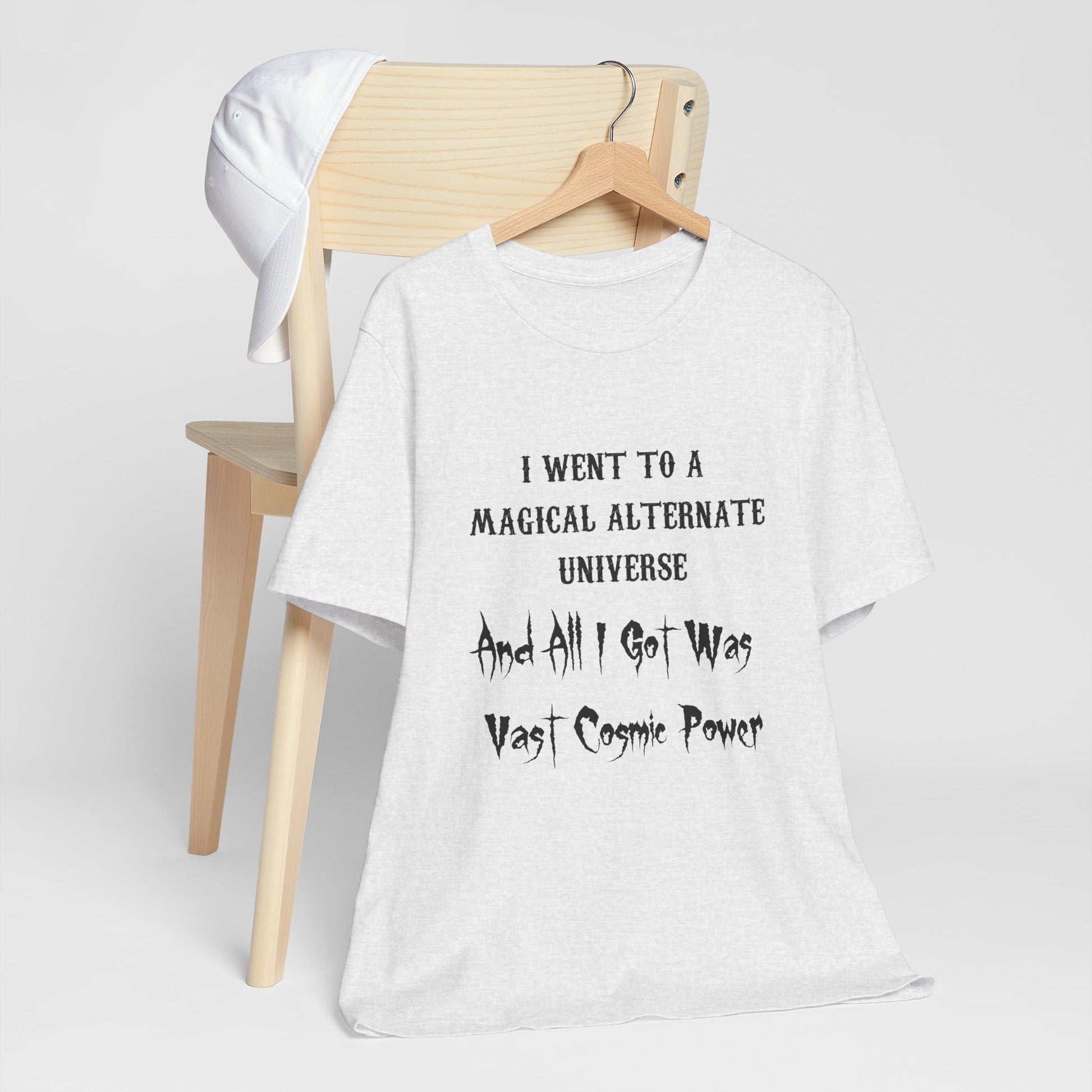 This unique t-shirt is a fanfiction depiction of the tshirt that Jason Asano is awarded for completing the Sanguine Horror quest that says "I WENT TO A MAGICAL ALTERNATE UNIVERS AND ALL I GOT WAS VAST COSMIC POWER". On the back is a fan fiction representation of the IRON SPIRIT COIN that Jason Asano's looting ability creates This classic unisex jersey short sleeve tee fits like a well-loved favorite. Soft cotton and quality print make users fall in love with it over and over again. These t-shirts have-ribbed knit collars to bolster shaping. The shoulders have taping for better fit over time. Dual side seams hold the garment's shape for longer.