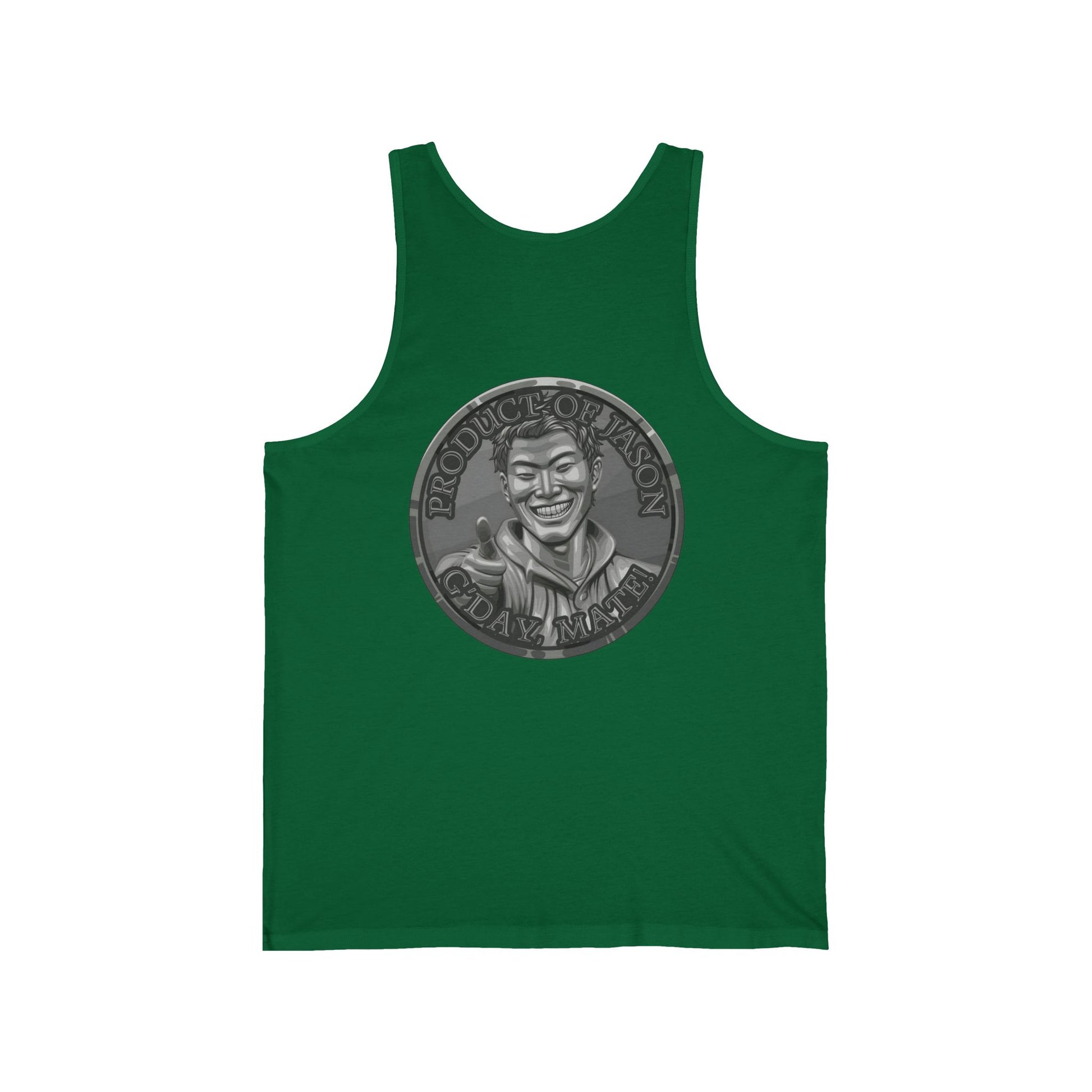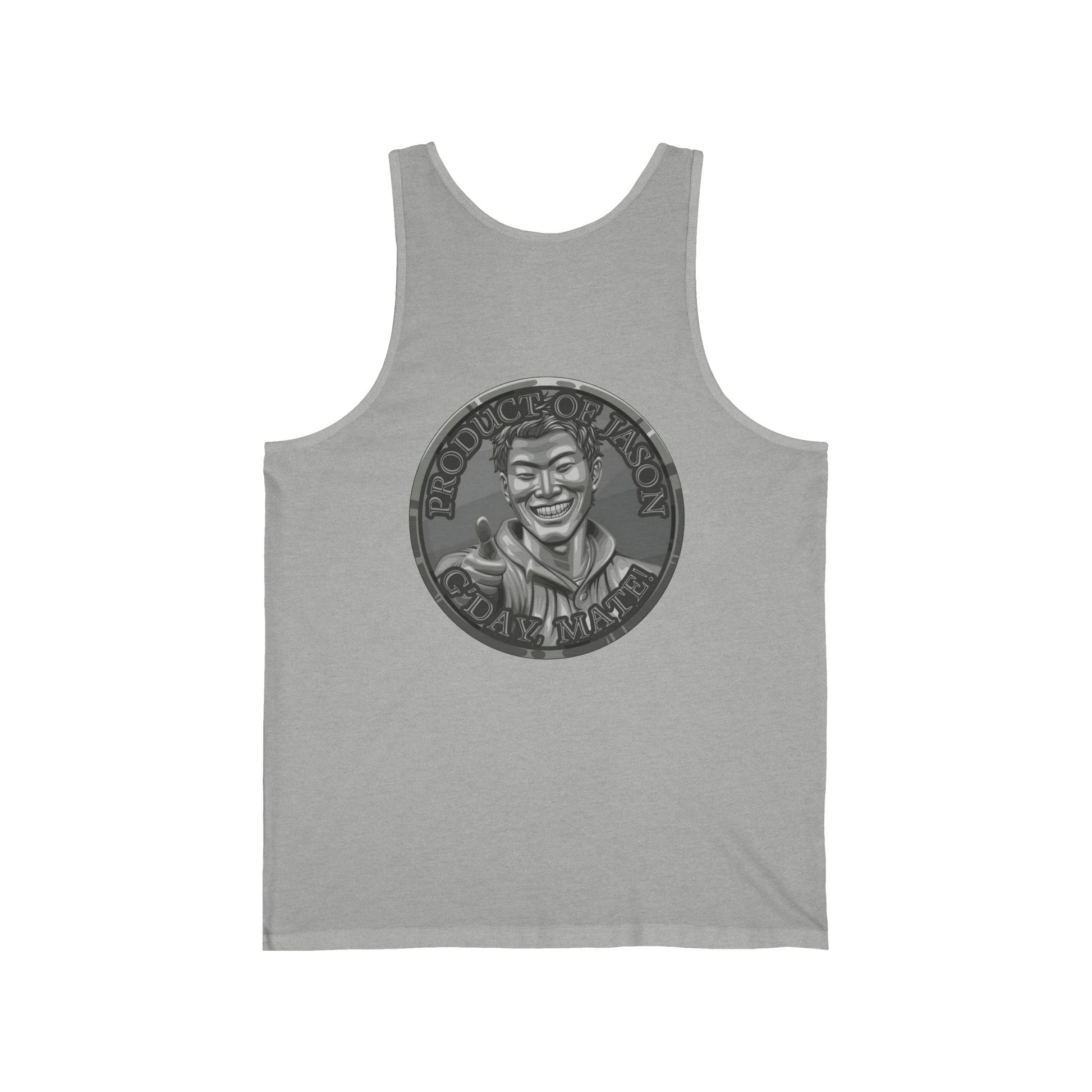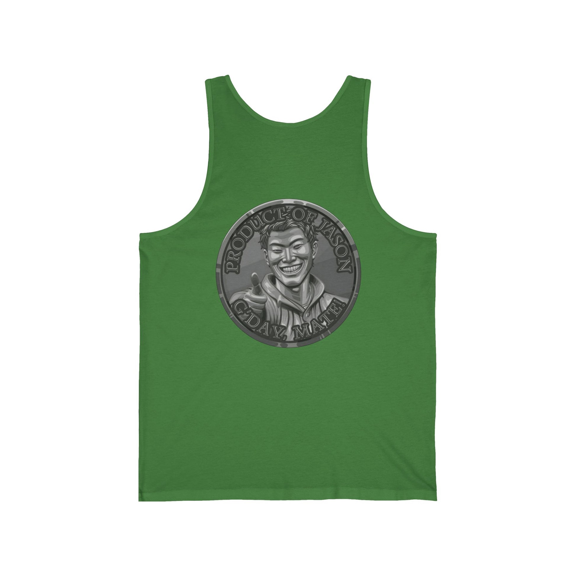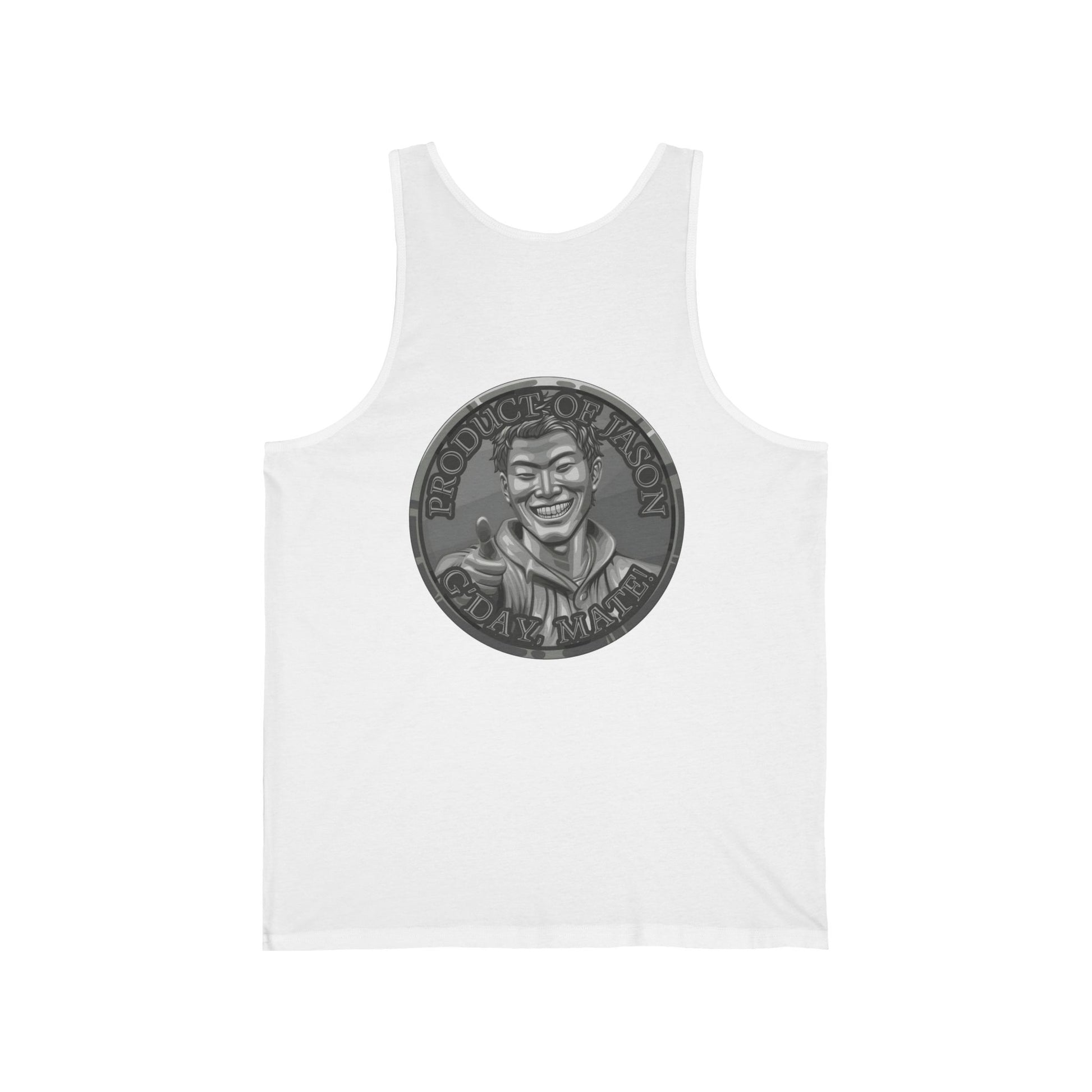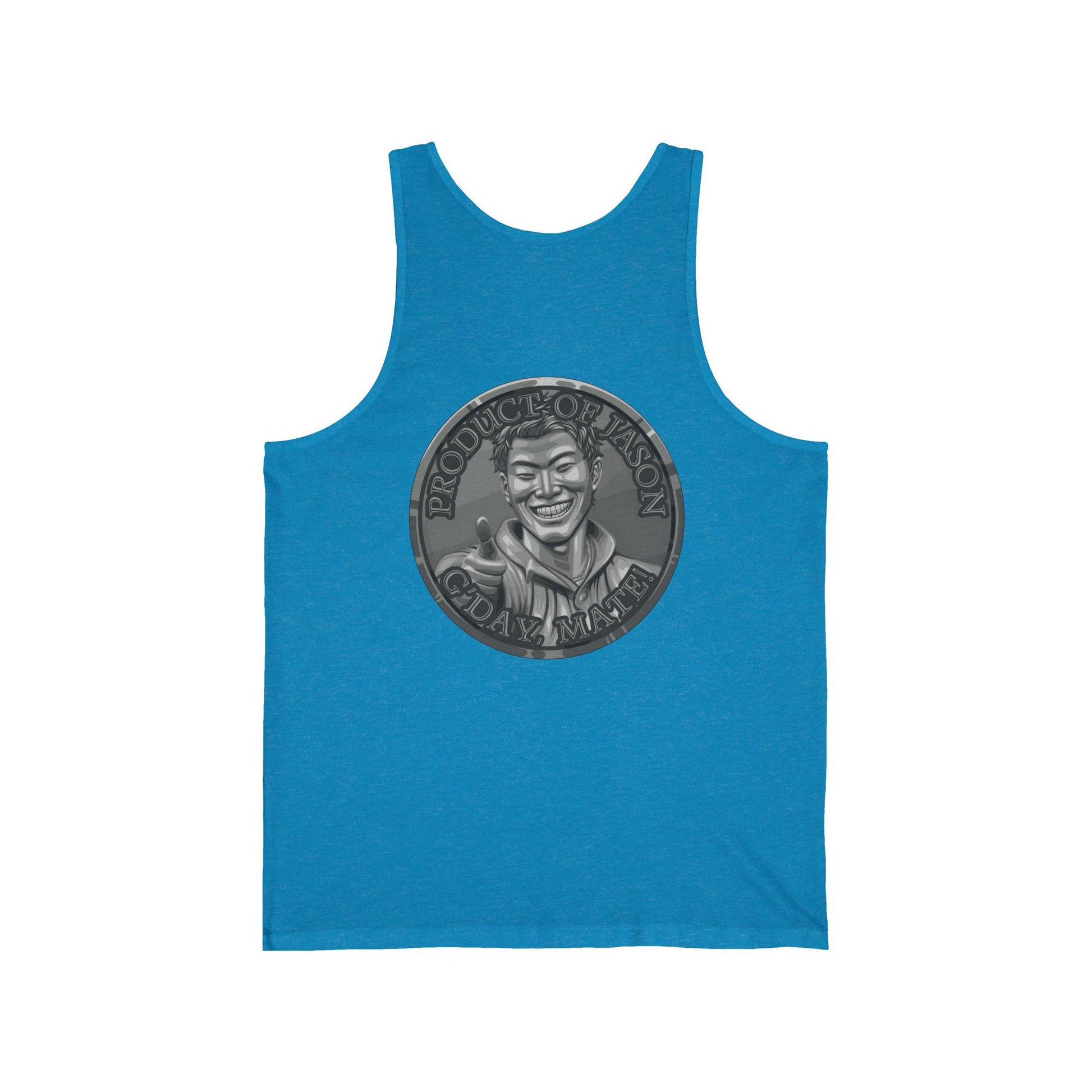 This unique tank top is a fanfiction depiction of the tank top that Jason Asano is awarded for completing the Sanguine Horror quest that says "I WENT TO A MAGICAL ALTERNATE UNIVERS AND ALL I GOT WAS VAST COSMIC POWER". On the back is a fan fiction representation of the IRON SPIRIT COIN that Jason Asano's looting ability creates. This must-have unisex jersey tank top fits like a well-loved favorite. High quality print makes it an ultimate statement shirt for years to come. This item has side seams to provide structural support. All bindings are the same fabric as the rest of the tank. Depending on the color, cotton, polyester, or rayon can appear.